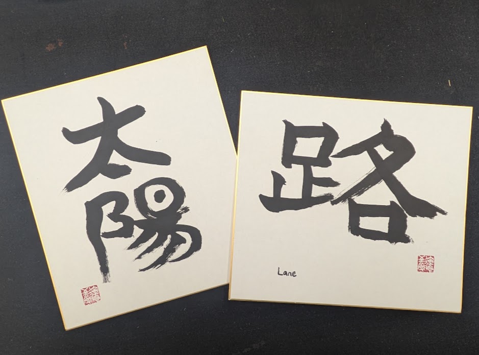 I prepared examples of the characters they chose. Lane selected “Road” (路) to reflect her name, and Courtney chose “Sun” (太陽).