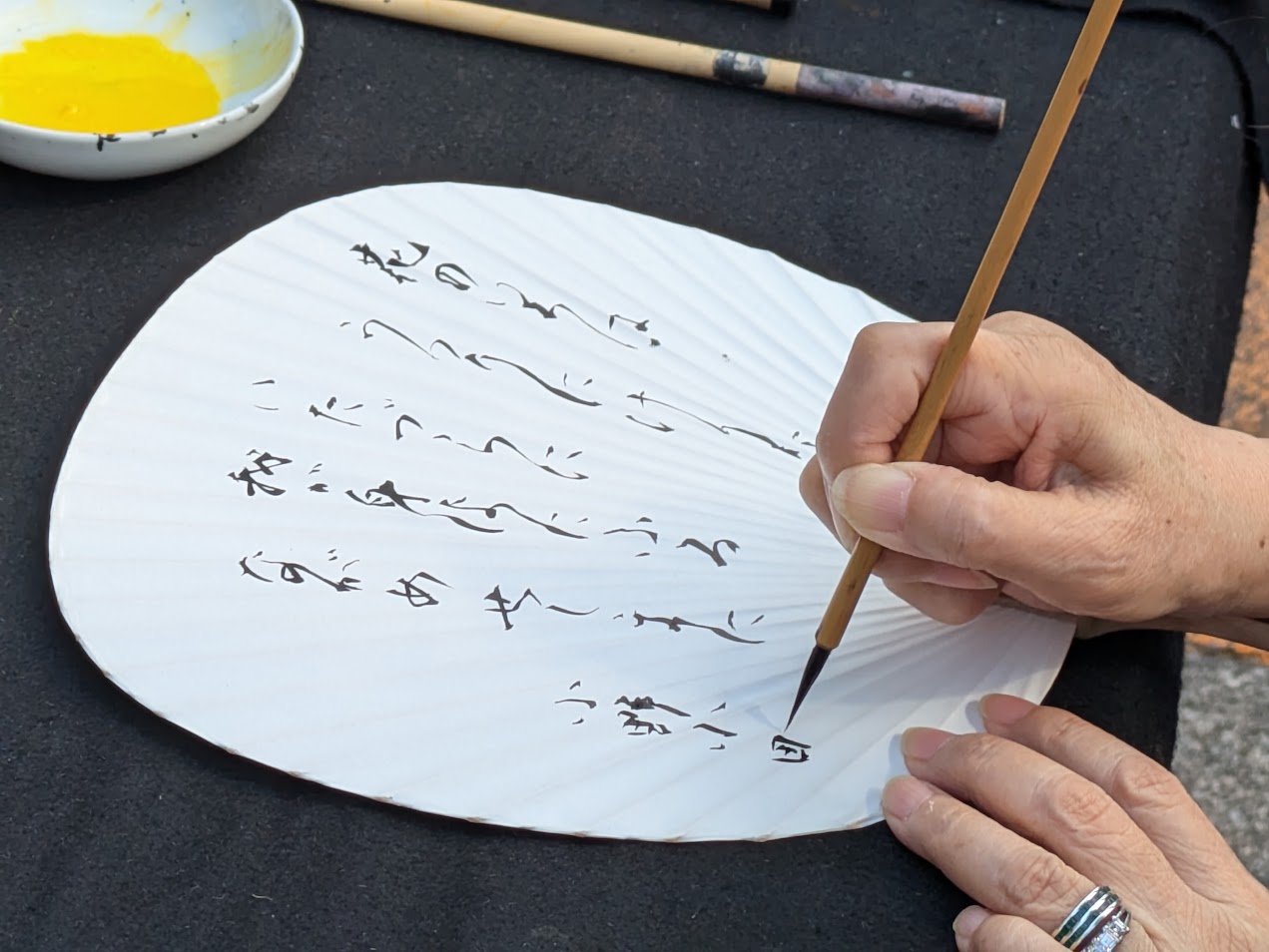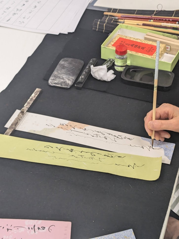 At the end of the workshop, you will complete your own piece by writing your name in kana on special paper such as shikishi (square calligraphy board) or sensu (folding fan).